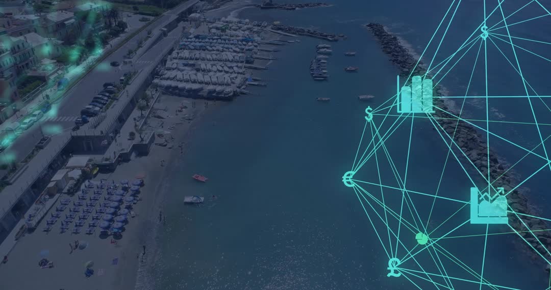 The scene shows beautiful aerial footage of a beachfront alongside intricate network graphics symbolizing financial data flow. This fusion of natural landscapes and digital elements creatively visualizes technology's influence on the world. Perfect for use in projects exploring themes of connectivity, coastal development, financial innovation, or tech integration into everyday environments.