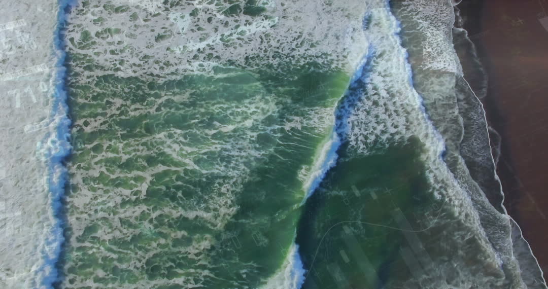 Aerial View Merging Analytics with Ocean Waves and Green Land Video