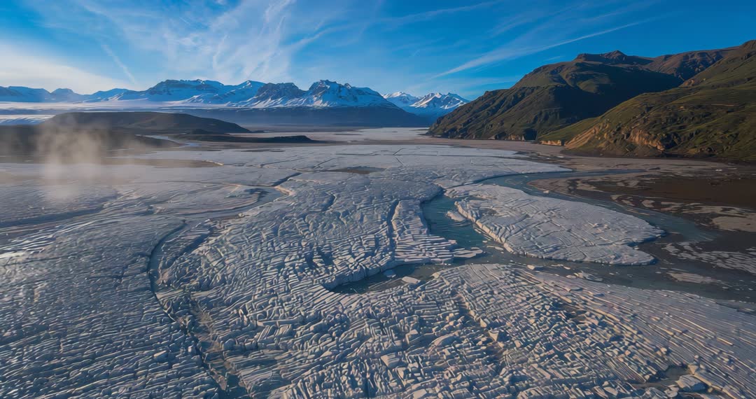 AI Generated Image. Footage uniquely captures sweeping view over glacier in remote arctic valley. Icy surface filled with detailed fractures, mist plume rising gently from ice, framed by snow-capped mountains in backdrop. Perfect for environmental documentaries, travel industry promoting arctic expeditions, or training materials on climate change and glacial environments.