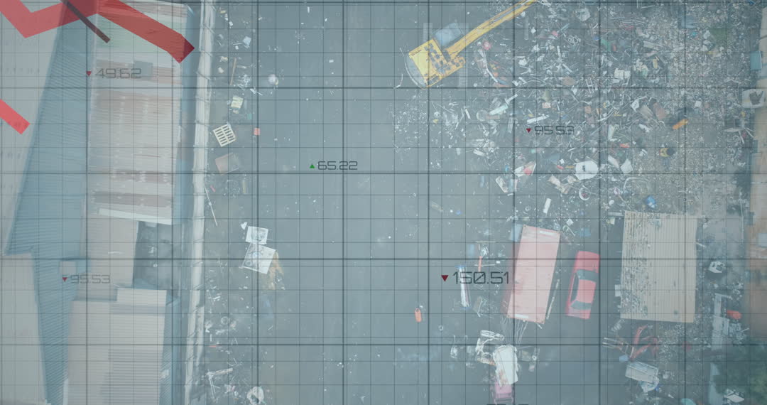 Overhead view of a cluttered industrial area filled with debris and construction materials. Grid overlay and alphanumeric codes imply data analysis and technological interfacing in the context of urban development or environmental assessment. Useful for illustrating themes related to urban planning, recycling, waste management, or data-driven infrastructure projects.