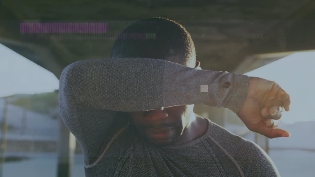 Image features African American athlete taking a break after training session, wiping forehead with arm under bridge. Digital interface overlays suggest use in sports tech or health monitoring contexts. Suitable for campaigns related to fitness, health technology, or athletic dedication.