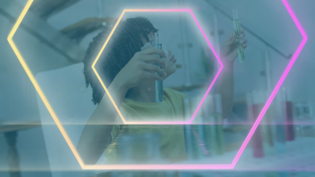 Child in educational activity with test tubes shown through geometric digital overlays, ideal for use in technical or educational publications embracing futuristic and innovative learning methods. Useful for promoting science education, diversity in STEM fields, or visual content on digital technology's role in education.