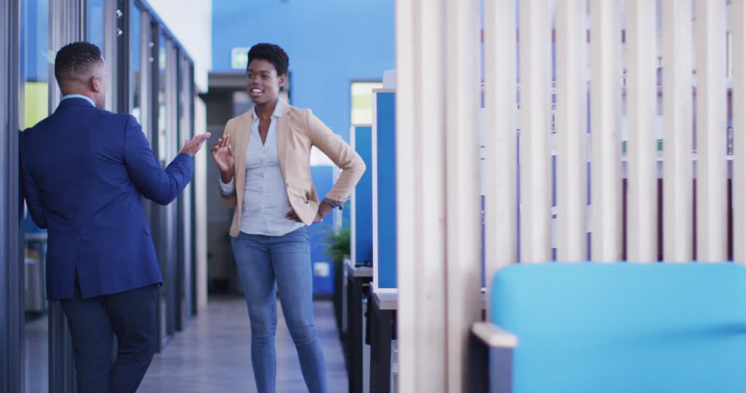 An African American woman and man are interacting in a contemporary office environment. Both dressed in professional attire, they appear engaged in a work-related discussion. This setting is ideal for emphasizing themes of teamwork, professional collaboration, and modern business environments. Useful for corporate, business culture, diversity, and human resources content.