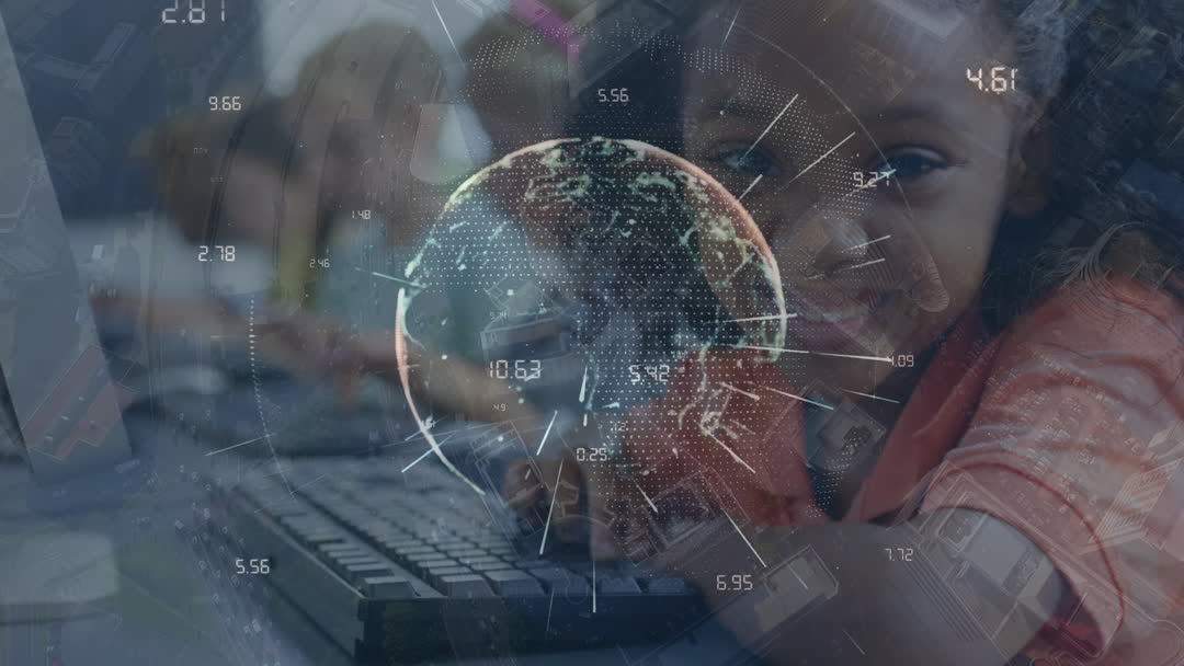 Young African American girl engaging with computers and technology along with an animated globe video overlay. The visual suggests themes of global connectivity and digital education. Perfect for use in materials focused on promoting STEM education, innovation in learning techniques, or illustrating futuristic educational environments.