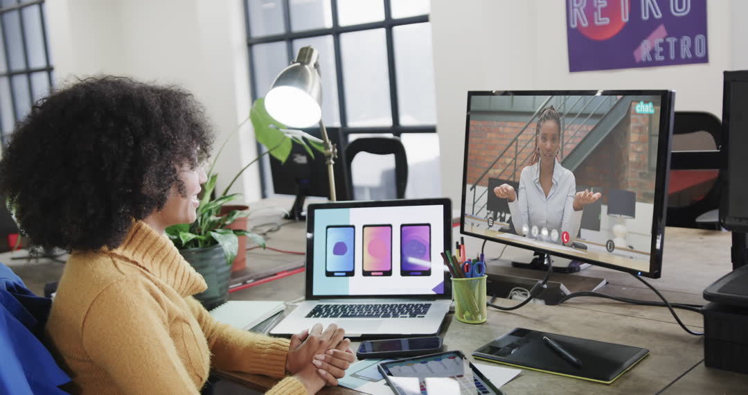African American businesswoman participating in a video call with a colleague displayed on her computer screen in a modern office environment. The desk is equipped with laptops and fashionable devices, indicating a tech-savvy setting. Perfect for illustrating concepts related to remote work, multicultural teamwork, digital communication, and professional networking.