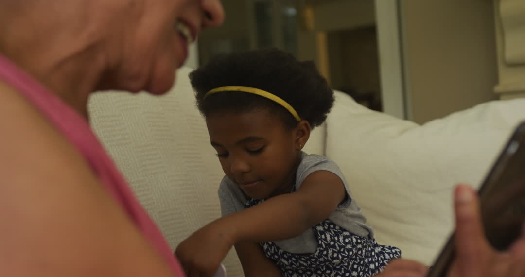 This captures a joyful moment between an African American grandmother and her granddaughter. They are exploring a digital device together in a cozy home environment. Ideal for themes of family bonding, intergenerational engagement, and the use of technology in everyday life. Useful for advertising family-related products, technology education, and lifestyle content.