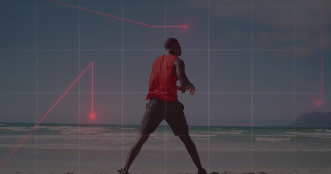 African American man in sportswear is stretching on a sandy beach, with a digital overlay of red light trails creating a futuristic effect. Perfect for illustrating themes of fitness and technological advancement. Ideal for use in fitness programs, tech-infused exercise promotions, and active lifestyle advertising.