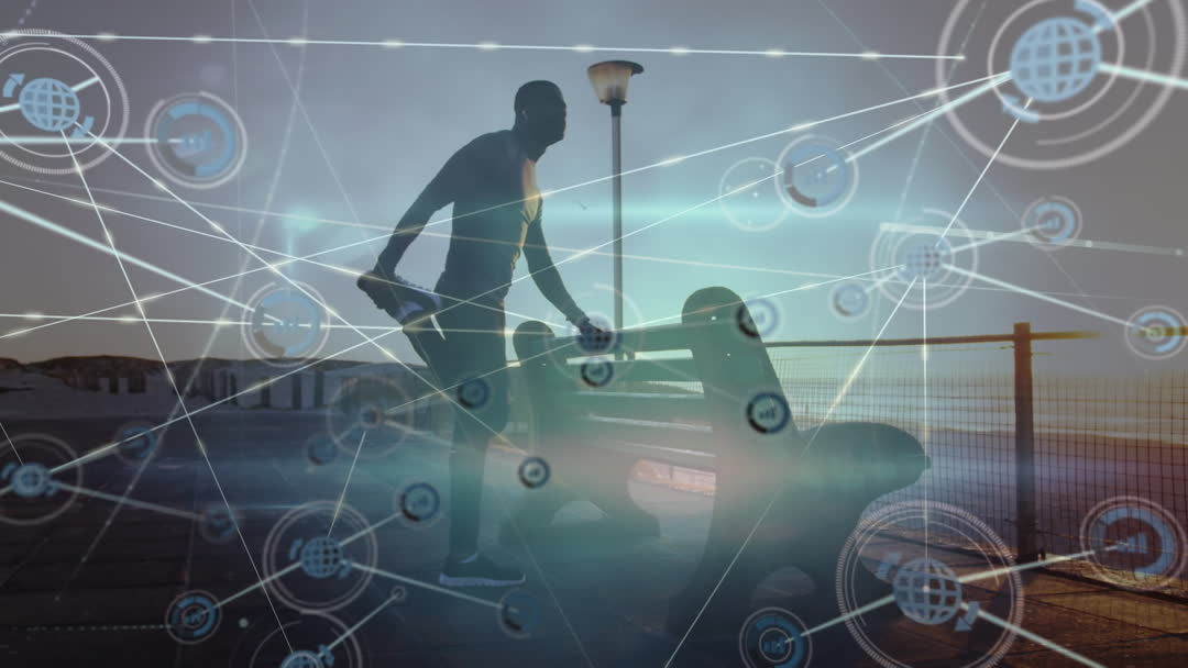 This visual depicts an African American man engaging in stretching exercises on a promenade with an overlaid network graphic representing digital connections. The video combines themes of physical wellness and technology. Ideal for use in articles or media highlighting the intersection of health, fitness, and digital innovation. Suitable for websites or advertisements related to tech-driven fitness, wellness apps, concept visuals for networking events, or lifestyle publications focusing on outdoor activities.