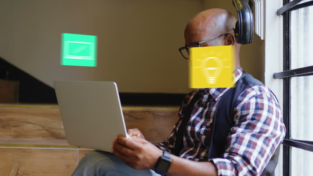 The video shows an African American man seated casually with a laptop, between overlays of technology icons symbolizing digital innovation and ideas. The setting suggests a modern and informal workspace. Useful for projects involving technology trends, remote business solutions, innovative digital processes, or portraying diverse professionals in a tech-driven atmosphere.