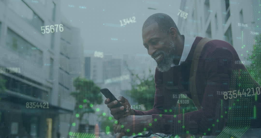 The video displays an African American man smiling while using a smartphone. Meanwhile, digital numbers and graphs are overlaid, suggesting data processing and finance themes. This visual is ideal for illustrating concepts of modern technology engagement, analyzing financial markets, or highlighting the intersection of technology and daily life. Perfect for use in articles, technology advertisements, and financial marketing materials.