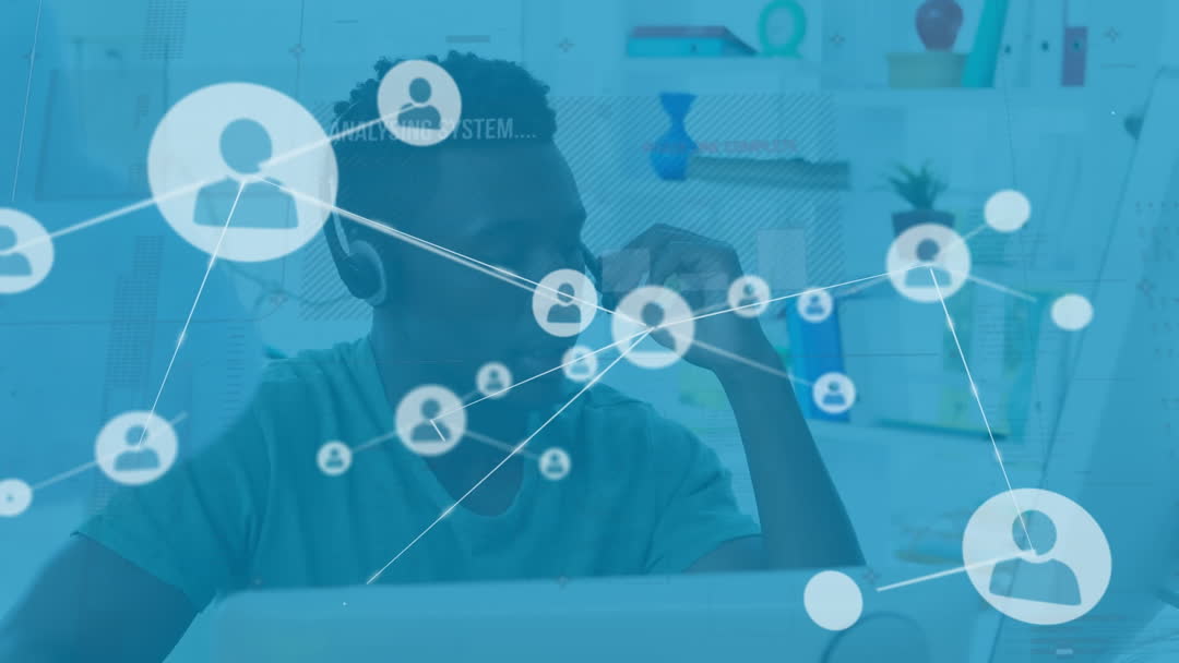 Man wearing headset in home office environment, surrounded by animated interconnected profile icons. Suitable for illustrating concepts related to business communication, team collaboration, remote work, customer support, and global networking solutions.