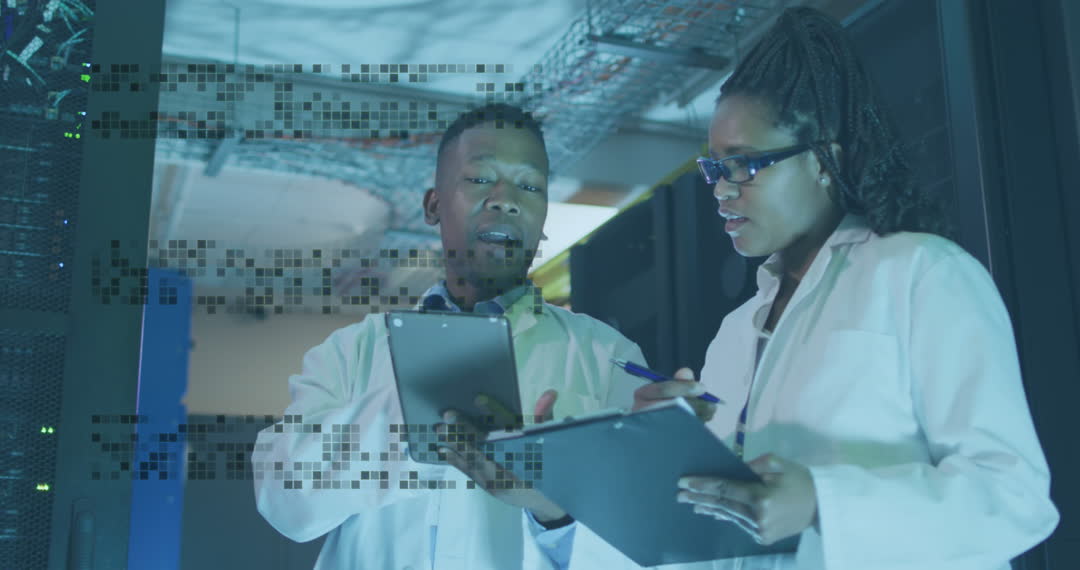 - African American Professionals Analyzing Server Data with Digital Overlay