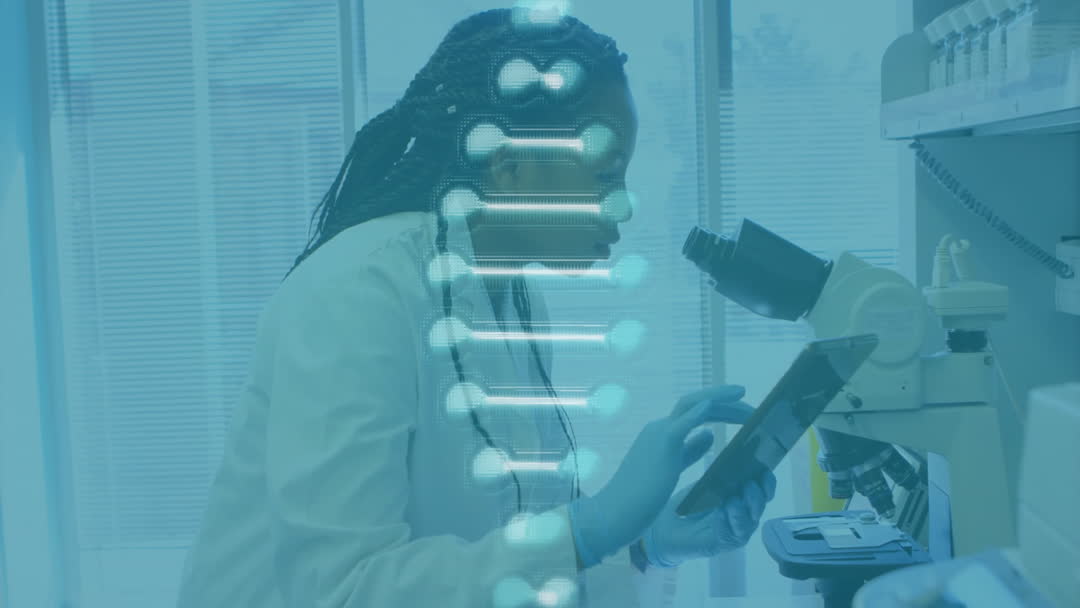 An African American female scientist works diligently in a laboratory, focusing on research with a digital animation of a DNA strand overlay. This videory symbolizes technological advancement and scientific inquiry. Ideal for illustrating advancements in biotech, medical research publicity, education on genetic studies, or promoting diversity in STEM fields.