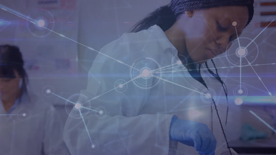 An African American female scientist in a lab coat is working in a laboratory, focusing intently on her task with futuristic network graphics overlayed. The video conveys themes of innovation, technology, and the advancement of science. A great fit for articles or presentations focused on scientific research, biotechnology, medical breakthroughs, or diversity in STEM fields.