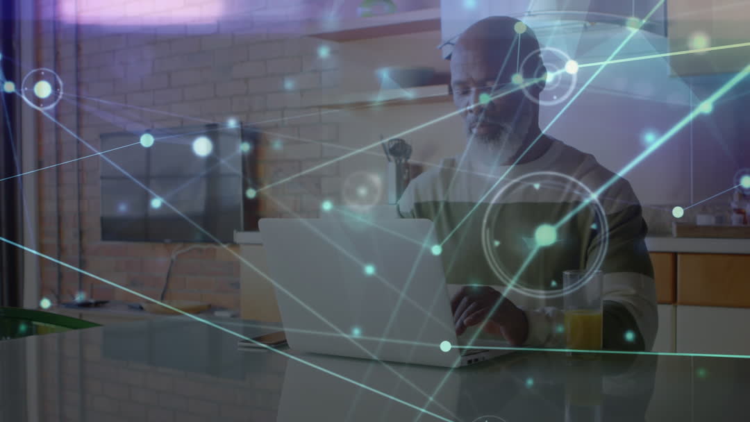 Senior African American man using laptop at home, illustrated by glowing network connections, symbolizes digital integration and modern technology usage. Ideal for representing remote work, technology trends, connectivity, and digital communication advancements in personal or commercial projects.