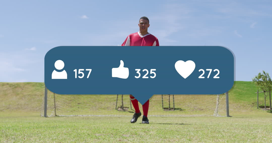 Ideal for illustrating social media engagement in sports, this visual shows a soccer player with digitally generated social media icons overlay, including followers, likes, and engagement all tally. Useful for campaigns promoting the digital transformation in sports and technology integration.