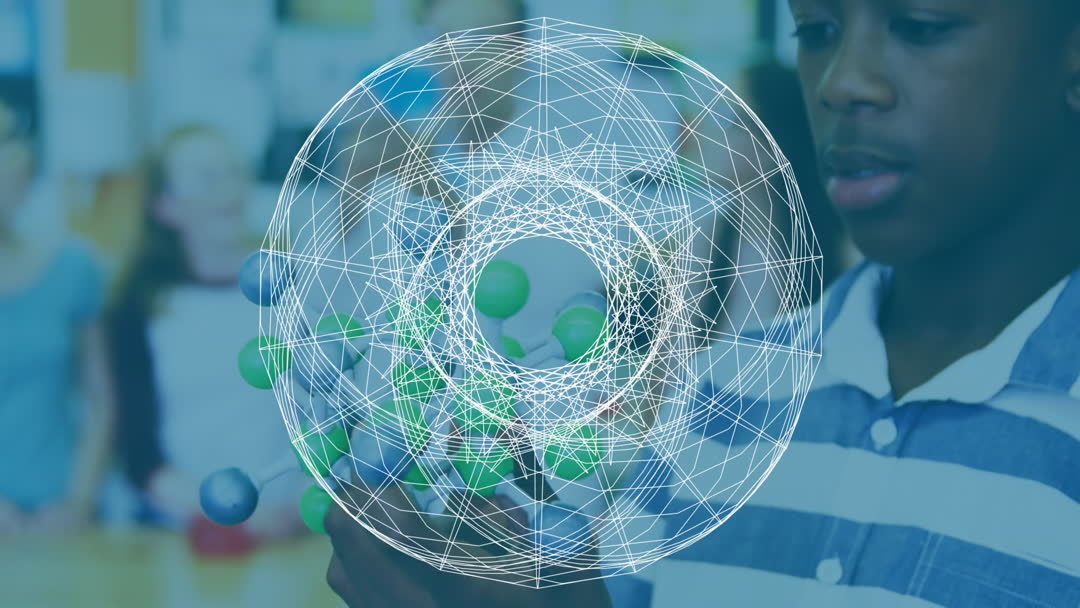 Depicts an African American student in educational setting examining a molecular model with technology-infused animation overlays. Ideal for illustrating themes of STEM education, child learning in science, and diversity in school programs.