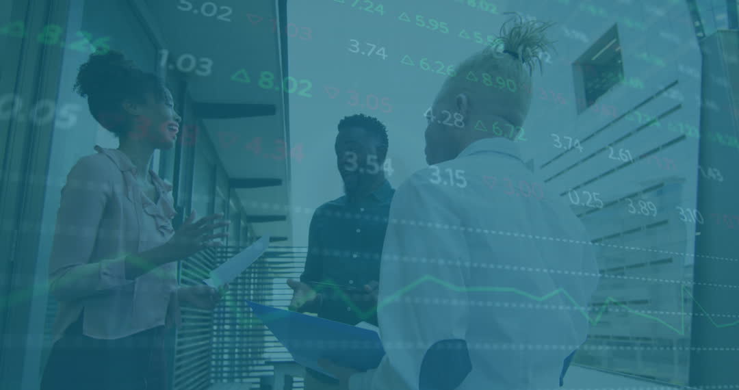 Three African American coworkers are collaborating in an office environment, discussing financial reports with a digital overlay of stock market data graphs and numbers. Ideal for illustrating concepts of financial teamwork, business meetings, or discussions about the economy and corporate strategies. Useful for websites or presentations related to finance, business, and economic growth.