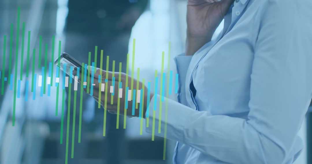 A thoughtful African American woman stands on a staircase, focusing on her cellphone with graphs animated over the video. This conveys themes of business analysis, data interpretation, and modern technology usage. Useful for illustrating concepts related to professional settings, innovation in tech industries, finance, or presentations featuring digital transformation.