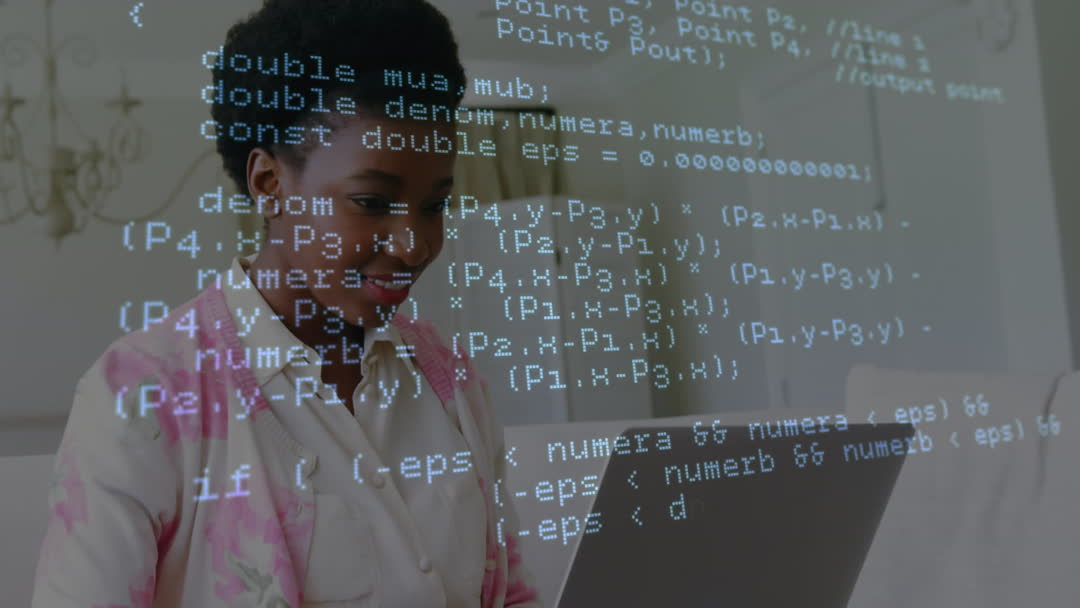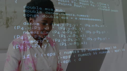 An African American woman working on a laptop from home with a digital data overlay representing programming or software development concepts. This can be used to symbolize remote work, technology engagement, or educational purposes in tech fields, perfect for illustrating concepts of networking, data science, and home-based tech careers.