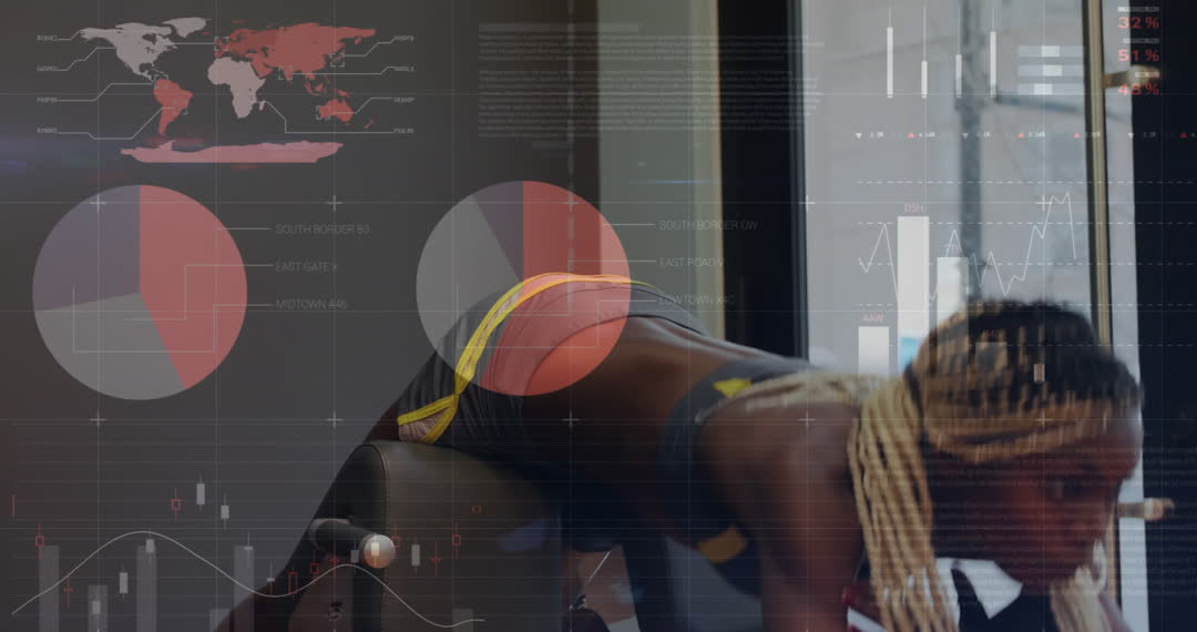 Animated scene shows an African American woman engaged in vigorous physical exercise at a gym. Overlay of digital graphs and charts is seen, symbolizing the integration of technology and data with fitness. This visual can be used in contexts like fitness apps promotion, healthy living campaigns, technology in sport discussions, or data monitoring applications targeting athletes and trainers.