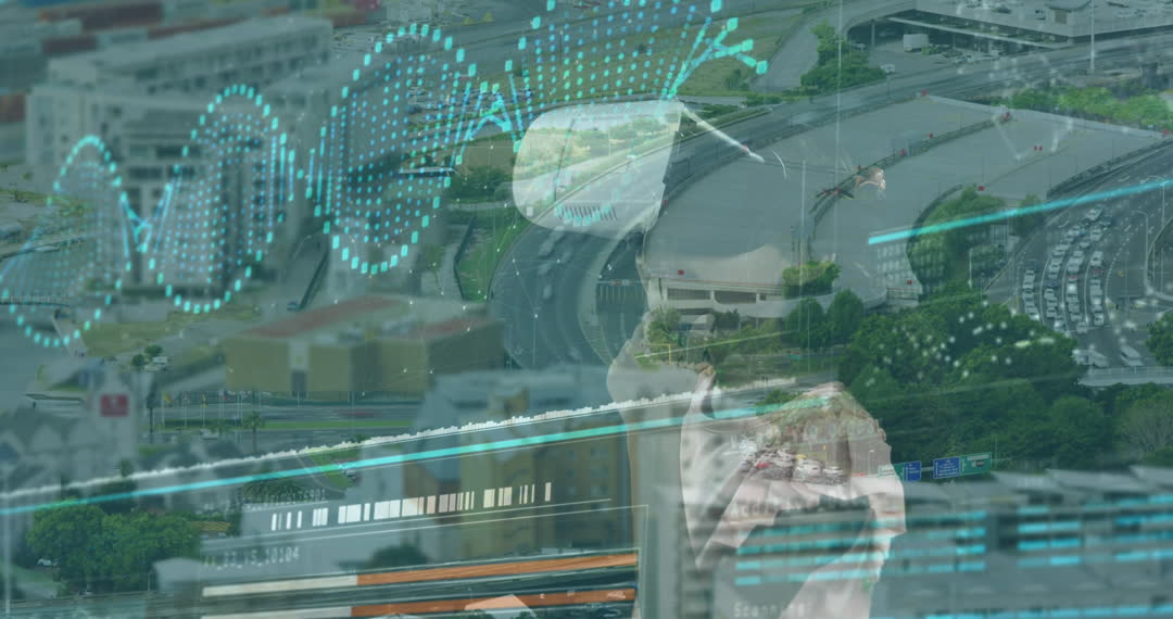 Virtual reality meets data visualization, showing digital innovation. Ideal for content about technology advancements, virtual experiences, and digital transformations. Fits well for articles on smart cities and technological integration.