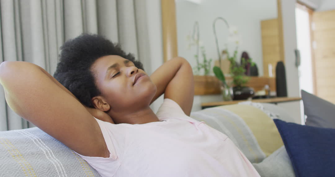 A woman of African descent is experiencing a moment of peace and relaxation while sitting on a sofa with her eyes closed. The relaxed posture and comfortable setting portray a leisurely domestic lifestyle. Ideal for illustrating themes of self-care, stress relief, home comforts, mental wellness, and personal downtime in articles, blogs, or advertisements related to home living and relaxation.