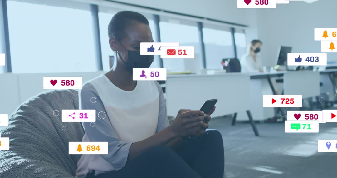 This depicts an African American woman in an office setting, using a smartphone while wearing a face mask. Social media interaction icons like likes, comments, and notifications appear around her. It highlights themes of connectivity, digital communication, social media engagement, and the impact of COVID-19 in workplaces. Perfect for content focused on digital trends, social networking, pandemic workplace adaptations, and online communities.