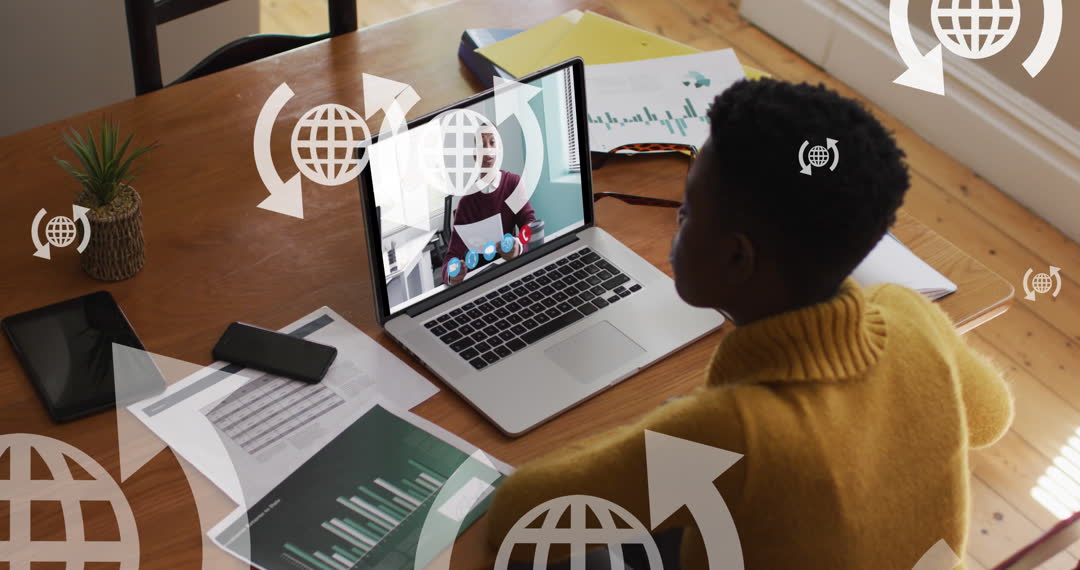 Shows an African American woman engaged in a video call using her laptop, highlighting global communication and technology in a home office environment. The overlaid globe icons symbolize worldwide connectivity, providing a business and digital networking concept. Useful for illustrating remote work practices and technological advancements in global business interactions.