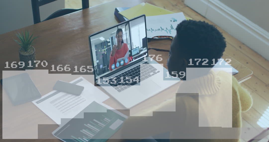 African American Woman Video Conferencing with Financial Data Overlay Video