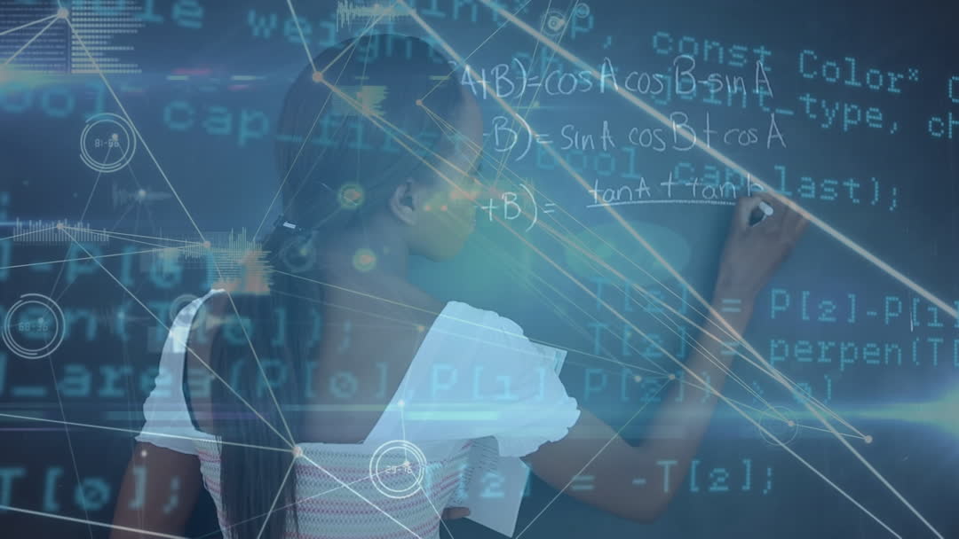 African American woman is writing on a chalkboard, overlaid with abstract digital data and mathematical formulas, symbolizing the integration of education with digital technology. This visual can be used for depicting modern educational methods, technology in learning environments, or promoting courses and initiatives focused on digital literacy and STEM education.