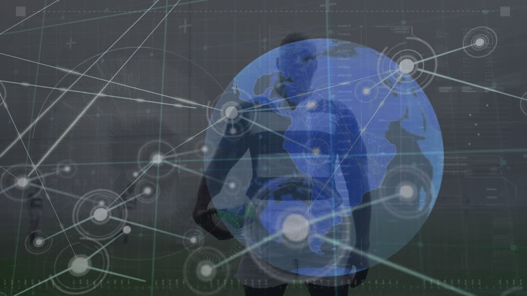 Depicting the intertwining of sports and technology, this video illustrates an African American soccer player against a digital background with futuristic connections and global map overlays. Great for articles and content discussing advances in sports technology, data analysis in sports, or the impact of digital innovations in athletic training.