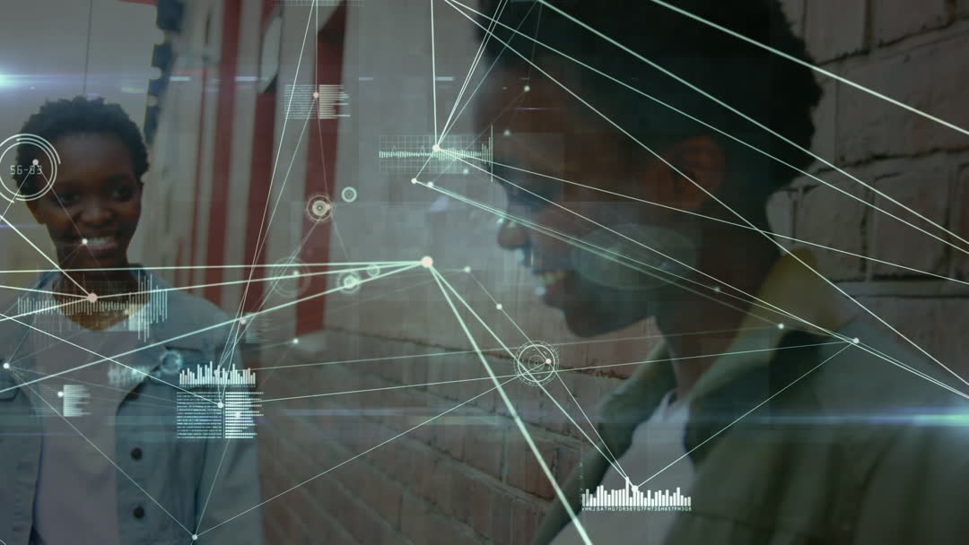 Twin Afro-American women are engaging with advanced communication technology, shown using smartphones. Data inspired visuals imply a connection between digital innovation and personal interaction. This video suits themes of modern technology, communication, relationships, or family bonding, and is ideal for illustrating futuristic or tech-focused concepts.