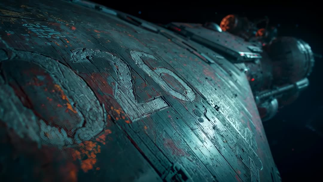 AI Generated Video. Tracking camera gliding across hull panel 2046 at aft, revealing weathered metal, peeling patina, deep seams, rivets and glowing thruster housings with ember-like sparks. Featuring high-detail surface texture and dramatic teal-versus-warm color contrast for cinematic mood. Providing short clip for title sequences, trailers, VFX breakdowns, game cinematics and concept reels. Helping designers and art directors illustrate long-term wear, space exposure and industrial aging on spacecraft exteriors. Serving as texture, lighting and particle reference for 3D artists, environment painters and compositors. Suggesting use in pitch decks, promotional reels, editorial content about space technology and futuristic exploration narratives.