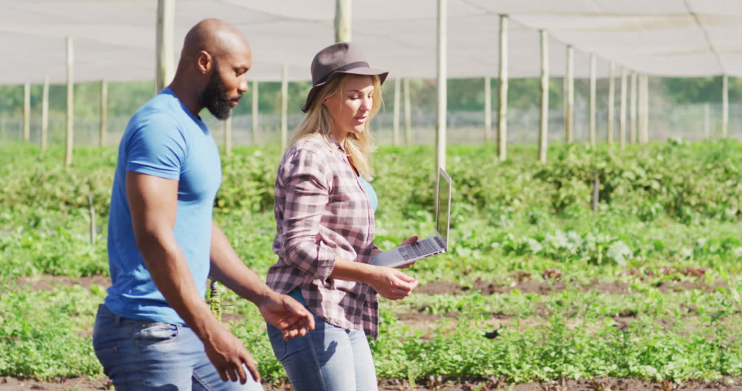 A man and woman collaboratively use a laptop while examining crops in a greenhouse. Highlights use of modern technology in farming. Useful for illustrating concepts of agricultural innovation, teamwork in farming, or diversity in business.
