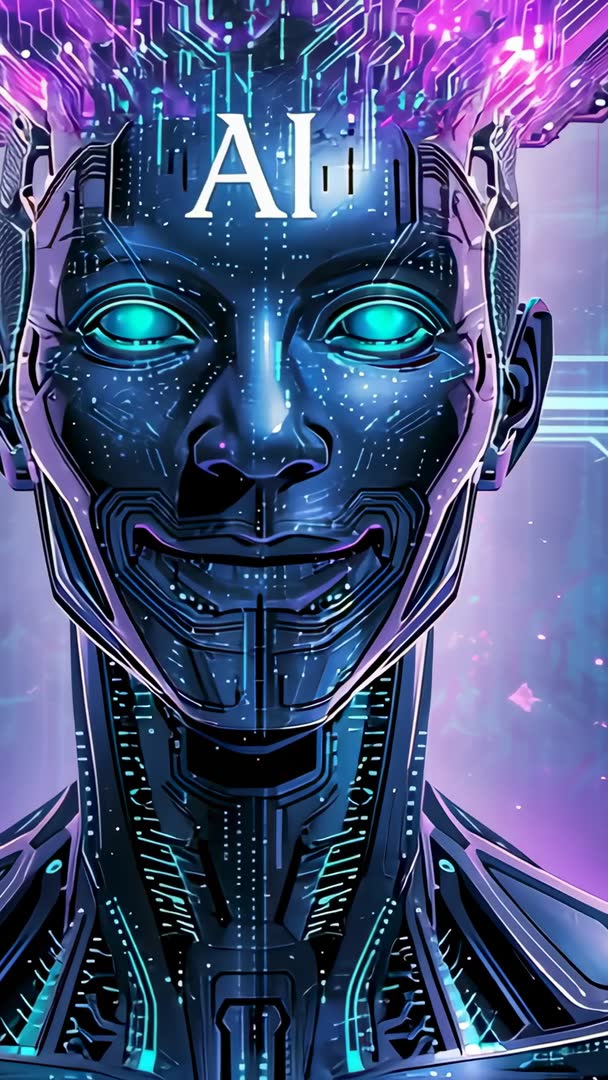 AI Generated Video. Vertical tech video showing AI android head powering up inside neon cyber void. Camera closing slowly, revealing glowing cyan eyes, pulsing circuitry, and AI logo illuminated on forehead. Visual style combining cyberpunk neon palette with high-detail circuit patterns, particle sparks, and holographic overlays. Motion designed for seamless looping and optimized for vertical mobile playback. Use cases include intro clip for technology channels, opener for AI conferences, vertical ad for robotics products, background for app promos, social media reels, and immersive trade show displays. Editing suggestions: adding bold headline text at top, placing logo in lower third, syncing ambient synth soundtrack with pulsing lights, and color grading to intensify magenta-cyan contrast. Technical specs: 9:16 aspect ratio, close-up framing, suitable for short loops (6–12 seconds), compatible with 4K export and vertical motion graphics workflows.