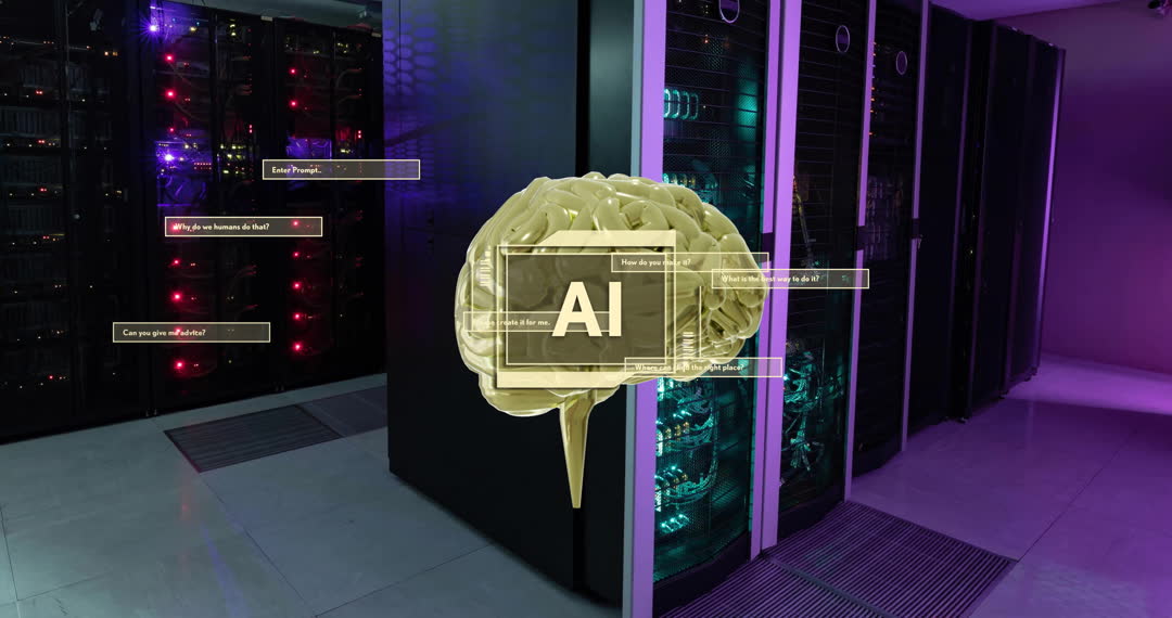 Digital representation of a brain overlaid on computer servers, implying artificial intelligence and data connectivity. Animated text around highlights AI's integration into real-world applications. Ideal for technology podcasts, articles on AI development, or promotional material for tech events showcasing advancements in digital processing and neural networks.