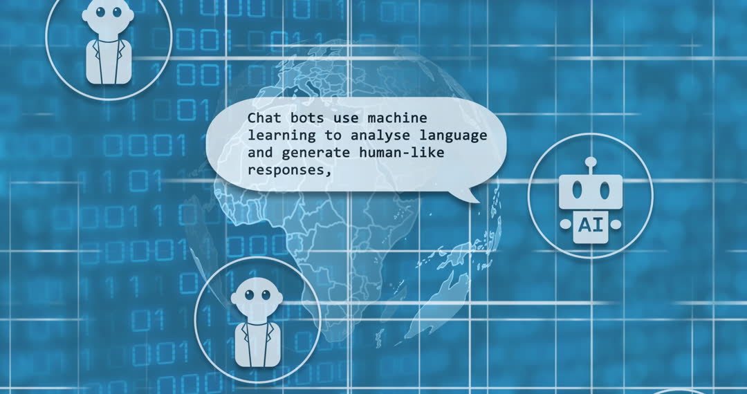 Illustrates concept of AI chatbots using machine learning in global digital communication. Suitable for articles, presentations, or educational purposes related to technology, innovation, and virtual interaction.