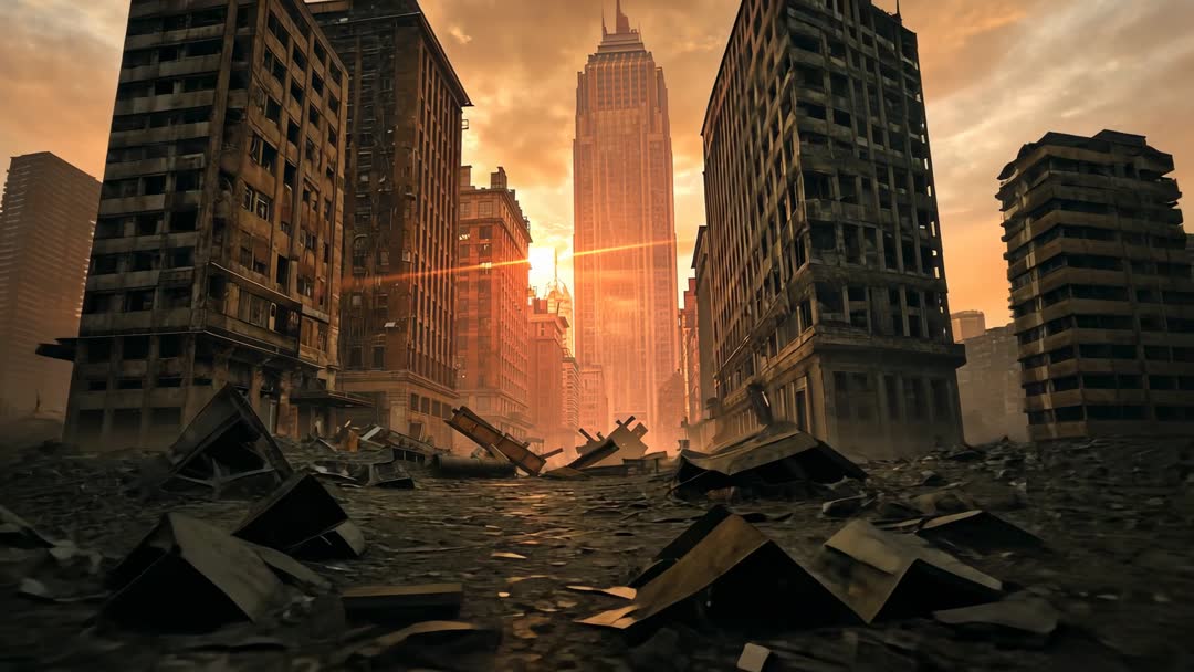 - AI-generated Cinematic Urban Apocalypse with Setting Sun