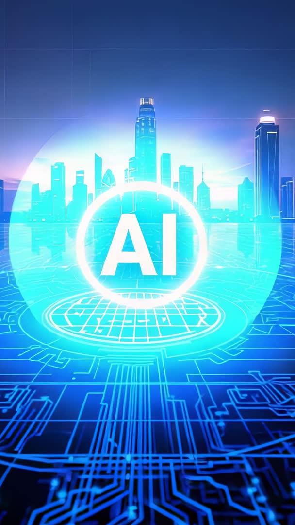 AI Generated Image. Futuristic vertical clip showing AI hologram emerging from pulsing circuit at waterfront, forming spinning globe above glowing city skyline. Neon blue palette and high-contrast highlights creating tech-forward mood. Circuit pathways and light traces pulsing with motion, globe rotating with particle effects and subtle lens flare. Ideal for tech product intros, startup pitch decks, AI service promos, app store previews, social media vertical ads, event openers, broadcast graphics, website hero backgrounds, explainer videos, corporate presentations. Use as loopable background for event booths or trade show displays. Add logo reveal at center of hologram, overlay bold headlines and lower-thirds, sync music to pulsing animation, color grade to brand palette. Format suggestions: vertical 9:16, 4K ready, loopable sequence, create 6-15 second cutdowns for social reels and 30-60 second edit for website or trade show playback. Include optional subtitles for accessibility and gradually increase glow intensity for dramatic reveal.