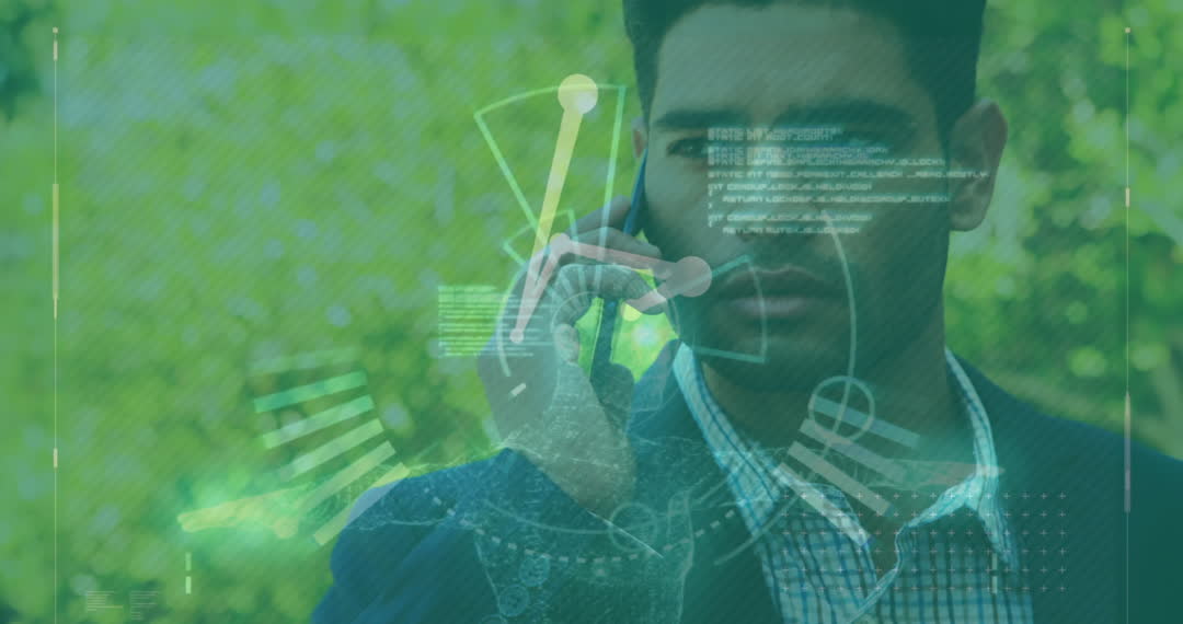 Stock video depicting a businessman engaging in a phone conversation, overlaid with futuristic AI graphics and digital data processing elements. Ideal for illustrating technology in business communications, modern networking solutions, or AI's role in professional settings, suitable for use in tech advertisements or business presentations.
