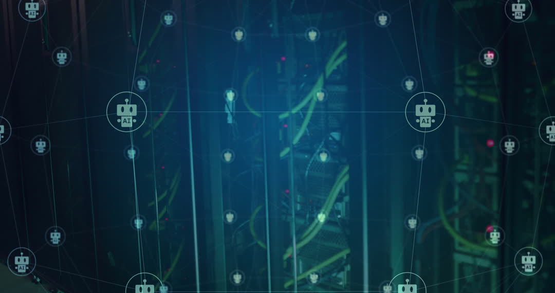AI network visualization showcasing interconnected chatbot icons overlaid on a server room backdrop. Ideal for themes related to artificial intelligence, digital communication, and technological advancement. Suitable for use in presentations about modern IT infrastructure and AI developments.