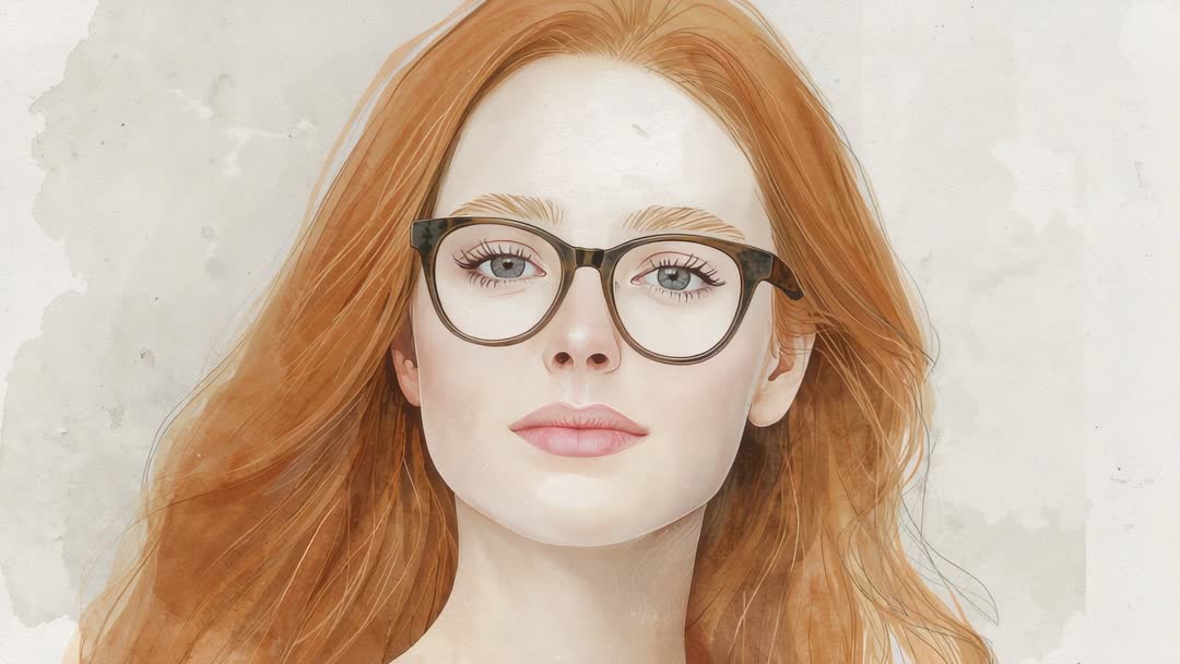 AI Generated Image. This video frame captures a serene portrait of a red-haired woman wearing glasses against a soft watercolor background. Her expression exudes elegance and sophistication, enhanced by the minimalistic artistic style. Ideal for use in content about beauty, fashion, art appreciation, and AI creativity.