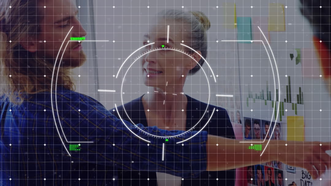AI Targeting Technology Overlay on Business Meeting Discussion Video