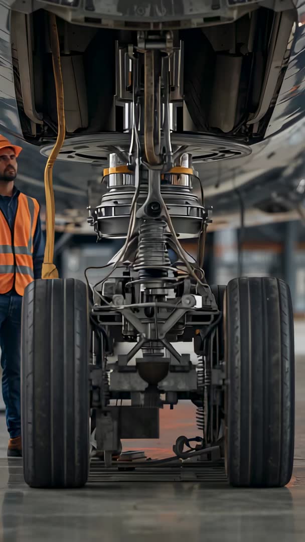 AI Generated Image. Vertical video showing low-angle close-up of main landing gear on commercial jet, featuring technician in high-visibility vest and yellow cable. Footage highlighting wheel assembly, shock absorber, actuators, hydraulic lines and wiring harness with hangar environment providing industrial context. Scene capturing hands-on inspection, safety checking and pre-flight maintenance workflow. Usage ideas: using as B-roll in corporate aviation videos, adding to maintenance training modules, including in safety briefing presentations, creating short-form social reels for LinkedIn and Instagram, or featuring in MRO service marketing. Technical notes: suitable for voiceover and on-screen annotations, supporting color grading and cropping for 9:16 vertical formats, available for both short clips and extended tutorial sequences.