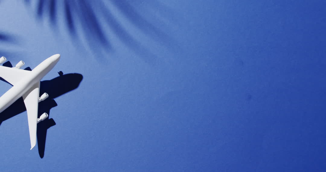 Small white airplane model casting a shadow reminiscent of palm leaves against a deep blue backdrop, evoking ideas of travel and wanderlust. Perfect for illustrating themes related to air travel, vacations, transport innovation, and exotic destinations. Ideal for travel blogs, vacation package promotions, and border concepts for flyers and social media graphics.