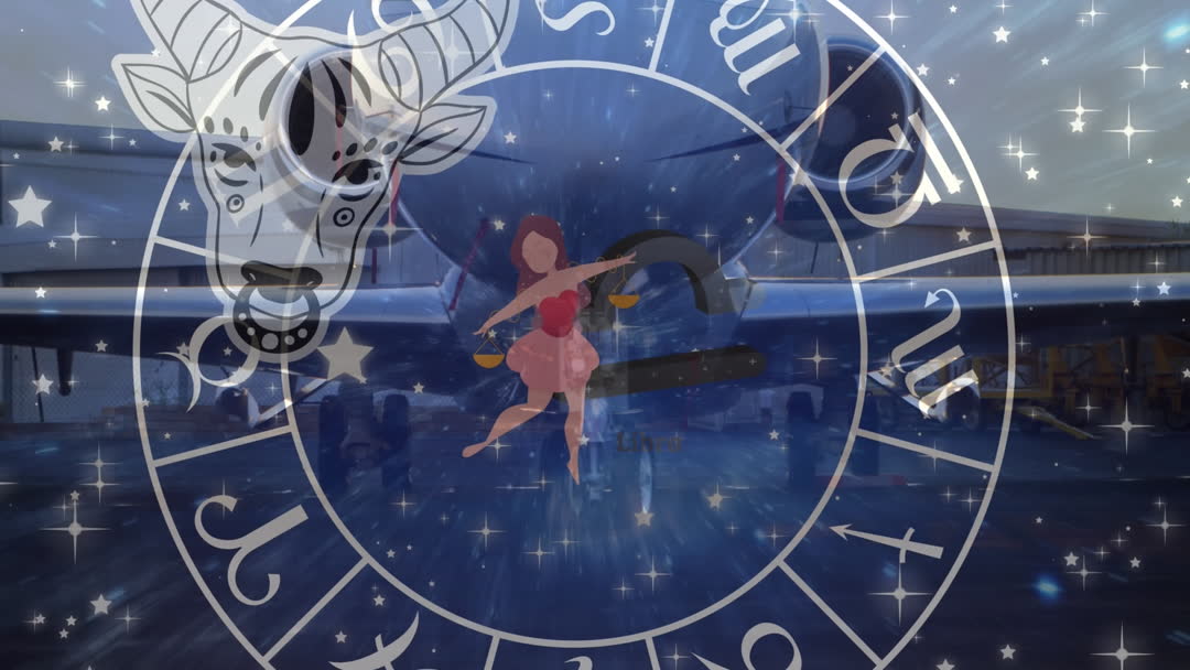 This animation illustrates a zodiac wheel spinning over an airplane, blending themes of astrology and international travel. Suitable for use in presentations or content related to astrological forecasts, travel horoscopes, or global tourism industry discussions.