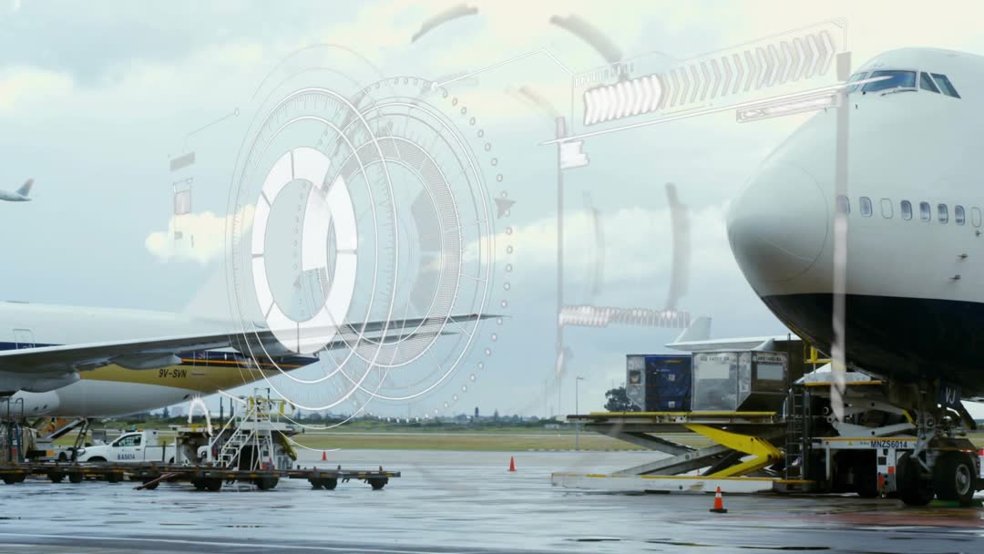 Futuristic video showing large aircraft at airport being loaded with cargo, complemented by a digital HUD visualization projecting rotating data points. This depiction blends real-world transportation scenarios with advanced technology, emphasizing modern logistical efficiency and digital connectivity in aviation sectors. Ideal for use in presentations on aerospace innovation, smart logistics solutions, and digital transformation in industry's operations dissection.