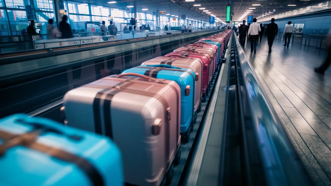 AI Generated Image. Colorful suitcases move along a conveyor walkway in an airport terminal, while travelers pass nearby. This dynamic scene represents modern travel and transit efficiency, ideal for illustrating articles or materials on transportation, airport logistics, or global travel trends.