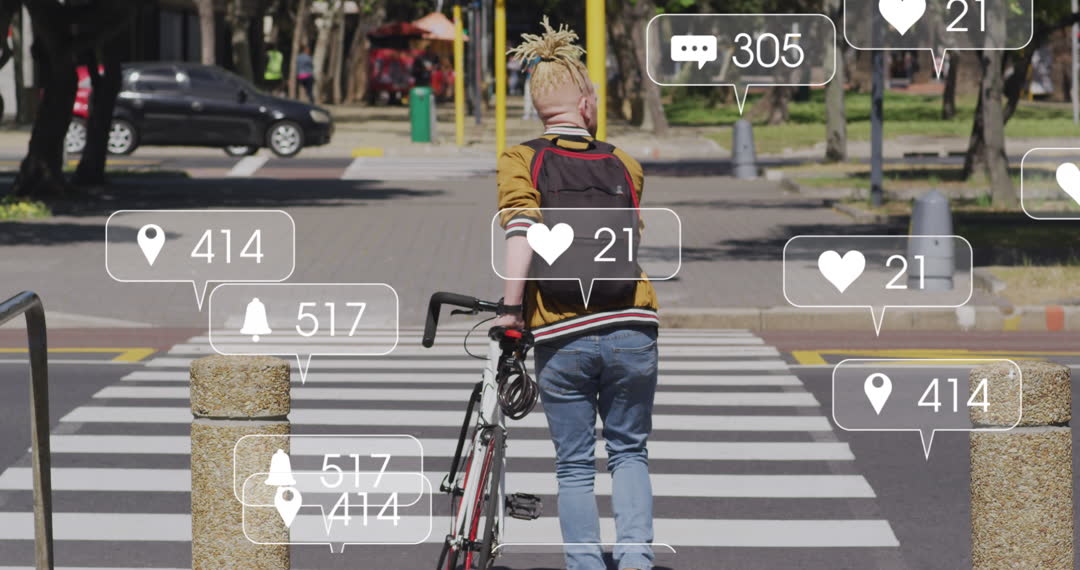 - Albinism Dreadlocks Man with Bicycle on Crosswalk and Social Media Icons